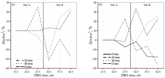 The influence of the TCDD class on the average tree value regarding the DBH class is shown in Figure 2a. On site A, the average tree value remains the same up to DBH class 22.5, regardless of the TCDD class. This trend was caused by the small diameter of the produced logs, and despite their quality, they were classified as FW. In DBH class 27.5, D trees had a higher average tree value of 24.6% compared to the H trees. The significantly higher average tree value of D trees is the result of the previously mentioned higher share of SL. On site B, D trees had a lower average tree value in all DBH classes; 3B trees showed a decrease in average tree value in DBH class 32.5 by 24.0%, while the increase in average tree value was determined in DBH class 37.5 by 14.0% and DBH class 42.5 by 23.6%; 3A trees showed an increased average tree value from a minor 1.9% in DBH class 37.5 to 20.5% in DBH class 42.5.