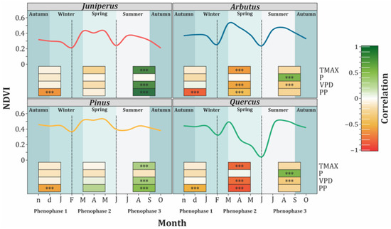 | Quercus–TMAX | NDVI = −0.02 × TMAX + 0.71 | 0.66 | ||