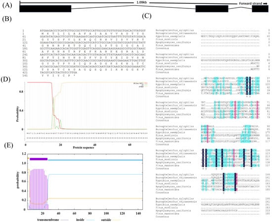 Bioinformatic analysis of Bxtlp. (A) Genomic DNA structure of Bxtlp. The lines represent introns, and the black parts represent exons. (B) Genomic sequence of Bxtlp and its translated amino acid sequence. “*” represents the termination codon. (C) Amino acid sequence alignment of BxTLP across Bursaphelenchus xylophilus, Bursaphelenchus okinawaensis, Hypsibius exemplaris, Pinus monticola, Apophysomyces ossiformis, and Pinus massoniana. Colors indicate conserved amino acid residues. (D) Predicted BxTLP signal peptide. (E) Predicted BxTLP transmembrane structure.
