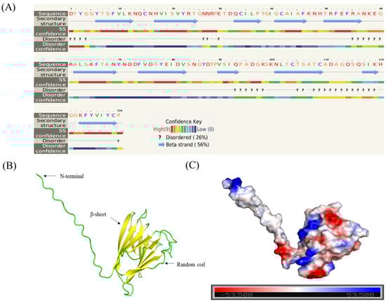 Predicted structure of BxTLP. (A) Secondary structure prediction of BxTLP. (B) Three-dimensional structure of BxTLP. (C) Electrostatic map of BxTLP displaying negative (red, −5KBT/e), positive (blue, +5KBT/e), and neutral (white) regions.