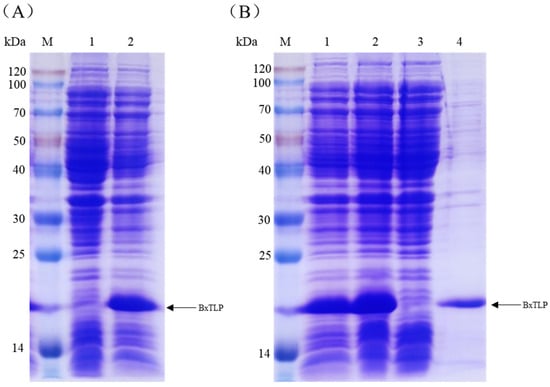 Plasmid pET-15b-Bxtlp was introduced into Escherichia coli BL21 (DE3) (Takara, Dalian, China) via transformation. One positive colony was inoculated into LB broth with 100 µg/mL ampicillin for cultivation at 37 °C overnight. The culture was further incubated for 4 h under the same conditions; then a final concentration of 0.5 mM isopropyl-β-D-thiogalactopyranoside (IPTG) (Sangon Biotech, Shanghai, China) was added to induce the expression of recombinant BxTLP for 4 h at 28 °C []. After centrifugation at 10,000 rpm for 25 min, the engineered bacterial cells were resuspended in 25 mL of binding buffer (20 mM Tris-HCl, 0.5 M NaCl, 5 mM imidazole, pH 8.0) and disrupted via ultrasonication (400 W, 4 s, 12 s, 120 cycles). The lysate was then centrifuged at 10,000 g for 30 min to remove debris. The purification of recombinant BxTLP was achieved through Ni-NTA (GE Healthcare, Chicago, IL, USA) affinity chromatography [].