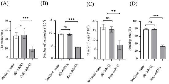 Effects of Bxtlp dsRNA on PWN motility (A), reproduction (B), oviposition (C), and egg hatchability (D) of PWNs. gfp dsRNA and sterile water as the control treatments. ** p < 0.005, *** p < 0.001, ns = not significant.