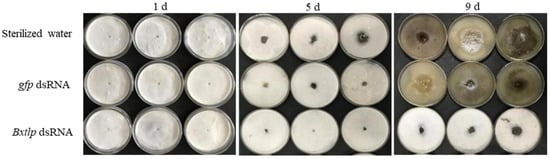 PWNs treated with Bxtlp dsRNA, gfp dsRNA, and sterilized water for 72 h were cultured on a PDA plate covered with B. cinerea. The feeding ability of the Bxtlp dsRNA group was significantly lower than those of the control groups. On the 9th day, almost all of B. cinerea in the sterilized water and gfp dsRNA groups had been consumed, while only a little of B. cinerea in the Bxtlp dsRNA group had been consumed (Figure 7).