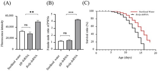 The fluorescence intensity of ROS in PWNs after Bxtlp dsRNA immersion was higher than those in the control groups (Figure 8A). The female–male ratio of PWNs in the Bxtlp dsRNA treatment group was 5, while the ratios of gfp dsRNA and sterilized water in the control group were 1.3 and 1.5, respectively (Figure 8B). Furthermore, the lifespan of PWN was investigated, and the results showed that it took 15 days for the PWNs soaked in Bxtlp dsRNA solution to reach the mortality of 80%, while it took 19 days for the ones soaked in sterilized water to reach the same mortality, which demonstrated that the lifespan of PWN was shortened after Bxtlp interference (Figure 8C).