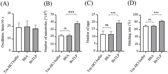 Effect of recombinant BxTLP on motility (A), reproduction (B), oviposition (C), and egg hatching (D). Control treatments: Tris-HCl buffer, BSA. Data analyzed by Student’s t-test; error bars indicate SE; *** p < 0.001, ns = not significant.