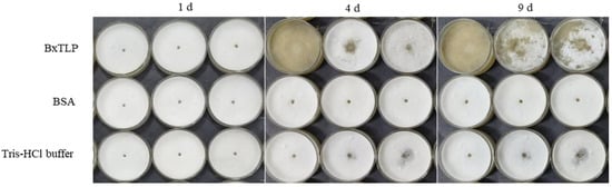 PWNs treated with recombinant BxTLP solution, Tris-HCl buffer, and BSA solution for 24 h were inoculated into 1-year-old saplings. On 5 dpi, the saplings inoculated with recombinant BxTLP-treated PWNs began to wilt. At the same time, the Tris-HCl buffer- and BSA-treated groups had no wilt symptoms. On 11 dpi, the Tris-HCl buffer- and BSA-treated groups began to show slight wilt symptoms. Most of the saplings in the recombinant BxTLP-treated group had completely withered at 14 days, while the ones in the Tris-HCl buffer and BSA treatment groups were still alive (Figure 12).