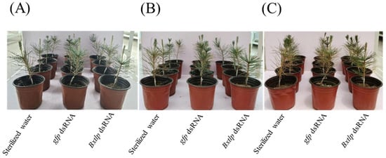 Approximately 2000 mixed-stage PWNs were immersed in a 50 µL buffer (1.0 µg/µL) containing Bxtlp dsRNA and incubated at 20 °C in the dark for 72 h []. Then, the nematodes were inoculated into 1-year-old Pinus thunbergii saplings. PWNs in sterilized water or gfp dsRNA were selected as controls []. The inoculated P. thunbergii saplings were cultured in a greenhouse at 25 °C with 16 h of light and 8 h of darkness. The wilting symptoms of the saplings were monitored and photographed.
