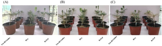 Impact of recombinant BxTLP on PWN pathogenicity in Pinus thunbergii at (A) 1, (B) 5, and (C) 14 dpi. Controls: Tris-HCl buffer and BSA.
