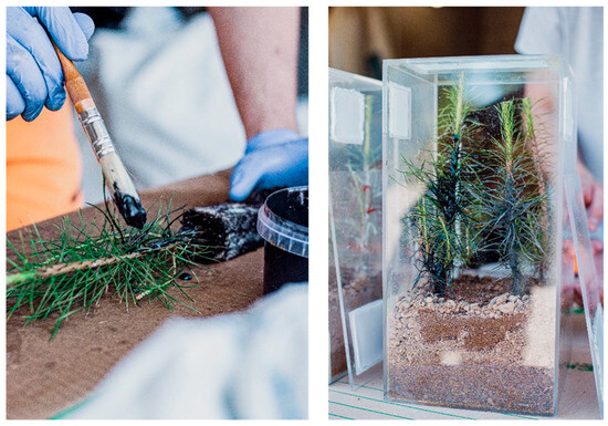 On the second day after the pine seedlings were planted, each insectarium was inhabited with two vigorous beetles. The insectariums were kept in a climate chamber under controlled conditions at 20 °C and a relative humidity of 60% for 20 days. The photoperiod was split equally into 12 h day and night periods. Illumination was provided by an LED, ensuring 150 µmol/m2, close to natural radiation. Seedlings were watered every 2–3 days by sprinkling while avoiding flooding the insectariums.