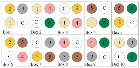 In total, five seedlings for each alternative repellent treatment and ten seedlings (replications) for the control were prepared (Figure 1). During the application, its timing and complexity (e.g., time of treatment, dripping, and coating quality) were recorded. In each insectarium, a seedling with the control repellent and three seedlings with random though non-repeating repellent treatments were randomly planted in a non-orthogonal design (Figure 2). If the seedling was taller than the box, its top was cut to fit. Untreated seedlings were not tested as in such cases the beetles would likely feed on the untreated seedlings exclusively, overestimating the effects of other repellents. Seedlings were watered and left in the insectariums for one day to “establish” before beetles were released.
