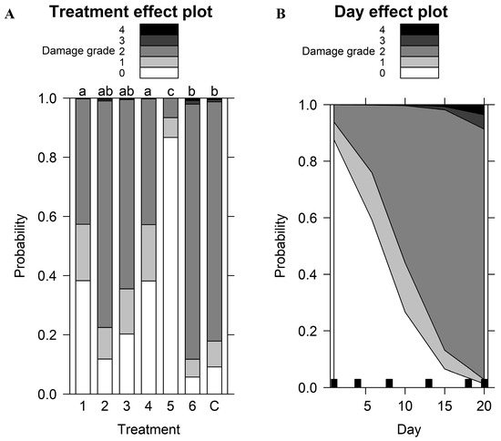 A mixed cumulative link model, which is a suitable method to determine the effects on ordered categorical responses for hierarchical data [43], was used to assess the effects of treatment (repellent) and day of the experiment (duration covariate) on the damage grade (as an ordered categorical variable; Table 2) and damage location (also as an ordered categorical variable with the levels ranging accordingly: no damage, untreated, untreated/treated, and treated). Box was used as the random effect. The significance of the fixed effects was estimated by the type II likelihood ratio χ2 test. Compliance of the refined model with statistical assumptions was verified using diagnostic plots. Data analysis was conducted at the significance level α = 0.05 in the program R v. 4.4.3 [44] using the library ‘ordinal’ [45].