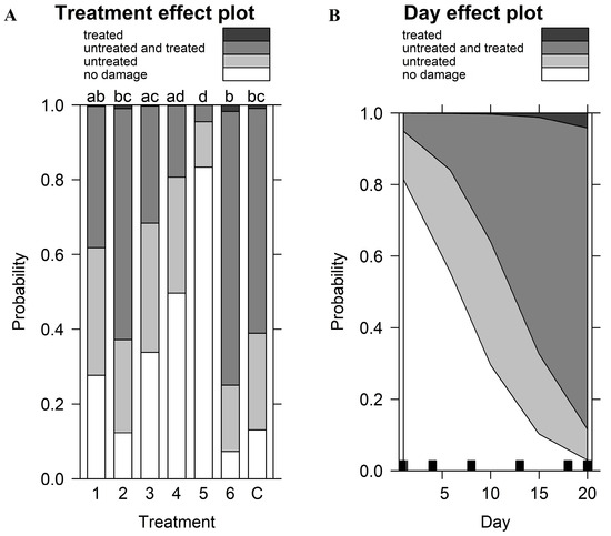 The tested repellents differed in effectiveness against large pine weevil damage as indicated by the significant effect of treatment both on the location and grade of the damage to the seedling (p < 0.001; Table 4). Regarding the damage location, partial effectiveness of the tested repellents was estimated as at the beginning of the experiment, damage mostly (78% of all damaged saplings) appeared on the untreated parts of the saplings (Figure 3). However, immediate (day 4) feeding damage in the treated parts appeared for the base with hemp oil (No. 6) and the control (C), followed by the base in combination with calcium carbonate (No. 1) on the eighth day, supporting their limited effectiveness. At the end of the experiment, however, damage on the treated parts exclusively were estimated for only 4% of the cases of saplings. This might indicate an opposite effect of the repellent, or might be related to poor consistency of the repellent, thus leaving easily accessible unprotected parts of the saplings. The proportion of simultaneous damage on both untreated and treated parts at the beginning of the experiment was estimated for ~5% of the saplings; however, it increased rapidly, reaching 85% of all saplings at the end of the experiment (Figure 3). The proportion of damage exclusively on the untreated parts was similar throughout the experiment, hence likely due to the consumption of untreated needles, slightly decreasing only at the end of the experiment (Figure 4B). The probability of the seedlings remaining undamaged through the course of the experiment was low (~2%; Figure 4B), indicating limited effectiveness of repellents under high herbivore (weevil) pressure [35].