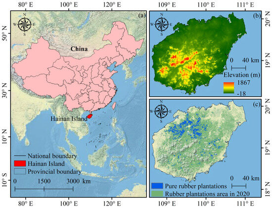 Study area: (a) geographical location of Hainan Island; (b) elevation; (c) distribution of rubber plantations.