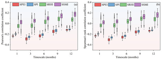 (a) Pearson correlation between different drought indices and STI-1; (b) Spearman correlation between different drought indices and STI-1.