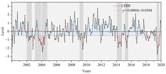 Time series of the monthly CDHI. The shaded areas in the background represent real drought and heatwave events. The dashed line represents the CDHE threshold (CDHI = −0.5).