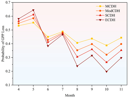 As shown in Figure 4, the trend of the probability of GPP loss for rubber plantations in Hainan Island under different compound drought and heatwave scenarios from April to November. As CDHEs intensified, the probability of GPP loss in rubber plantations increased significantly in April and May. In contrast, the trend of the probability of GPP loss from June to November was completely opposite to that of April and May, decreasing progressively from mild to extreme events. The probability of GPP loss peaked in May, reaching 0.554, 0.585, 0.612, and 0.645 under mild compound drought and heatwave (MCDH), moderate compound drought and heatwave (ModCDH), severe compound drought and heatwave (SCDH), and extreme compound drought and heatwave (ECDH) scenarios, respectively. In contrast, October showed the lowest probability, with values of 0.388, 0.320, 0.265, and 0.198 for the same scenarios.