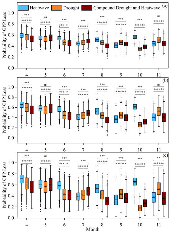 Probability of GPP loss in rubber plantations under (a) mild, (b) moderate, and (c) severe heatwave, drought, and compound drought and heatwave scenarios. Statistical differences among scenarios were assessed using the Mann–Whitney U test with Bonferroni correction. Asterisks indicate significance levels: * p < 0.05, ** p < 0.01, and *** p < 0.001; ns indicates no significant difference.