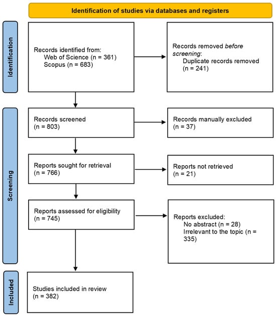 After experimenting with various search strategies and keywords, the phrases “principal component analysis (PCA) in forestry” and “utilization of principal component analysis (PCA) in forest research” were selected as the main search terms. This initial query retrieved 361 articles from Web of Science and 683 from Scopus. After removing duplicates (articles appearing in both databases), 803 unique articles remained. We then excluded records that could not be retrieved, those without abstracts, and articles deemed irrelevant to the topic. This refinement resulted in a total of 382 articles, which formed the basis of the analyses presented in Section 1. From a close evaluation of these 382 articles, only 96 were found to contain elements relevant for citation in our bibliometric and conceptual review (Figure 1).