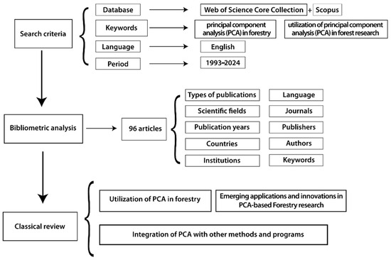 This study was conducted in two main parts. The first involved a bibliometric analysis aimed at evaluating global scientific research on the application of principal component analysis (PCA) in forestry from 1993 to 2024. Relevant publications were identified using the Science Citation Index Expanded (SCI-Expanded) within the Web of Science (WOS) database [24], as well as Scopus [25].