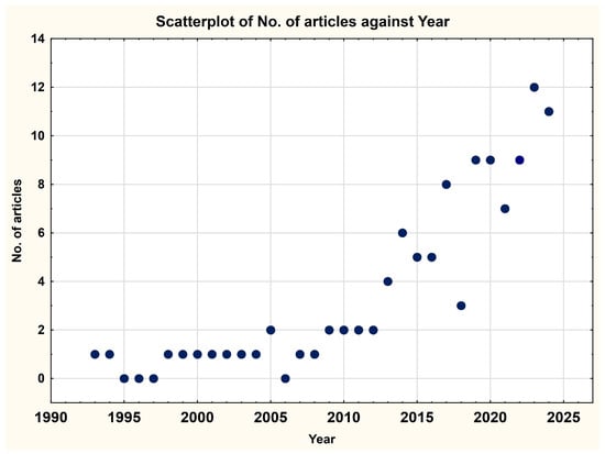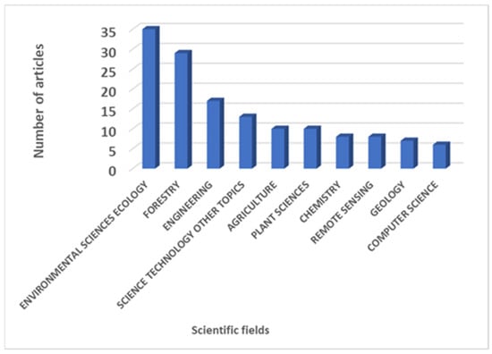 Among the 39 scientific fields to which the published articles belong, the most representative are Environmental Sciences Ecology (35 articles), Forestry (29 articles), Engineering (17 articles), and Science & Technology—Other Topics (13 articles). Other well-represented fields include Agriculture, Plant Sciences, Chemistry, Remote Sensing, Geology, Computer Science, and Water Resources (Figure 3), demonstrating the broad range of research areas where this modern analytical method can be applied.