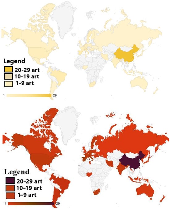 Data analysis was carried out using built-in tools from the Web of Science Core Collection, Scopus, Microsoft Excel [28], and Geochart [29]. For visual mapping and cluster analysis, VOSviewer (version 1.6.20) was employed [30].
