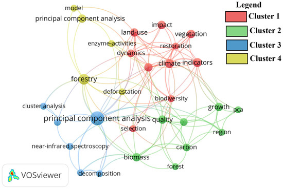 These keywords are grouped into five clusters: the first contains the keywords principal component analysis, forestry, deforestation, biodiversity conservation, GIS, cluster analysis, classification, agriculture, wood; the second: biomass, quality, restoration, carbon, association, biodiversity, soil, ecosystem; the third: land use, impact, river, model, management; the fourth: climate, diversity, growth, region, impacts, sustainability; the fifth: indicators, soil quality, degradation, enzyme activity (Figure 6).