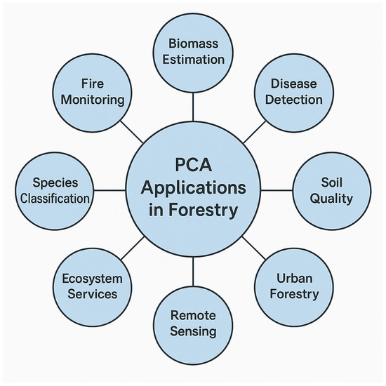 To synthesize the scope of PCA applications in forestry, we provide a visual overview that categorizes its uses into thematic areas (e.g., remote sensing, forest health, biodiversity, etc.). This overview supports reader comprehension and provides a rapid reference for the diverse roles PCA plays in forest science (Figure 8).