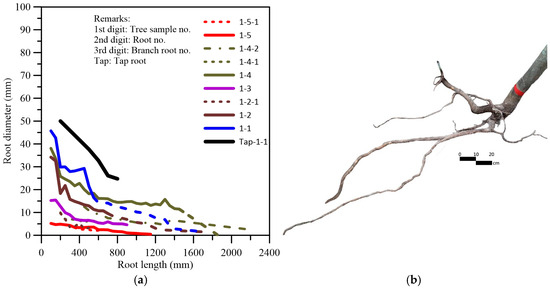 - Shrestha, M.B.; Horiuchi, M.; Yamadera, Y.; Miyazaki, T. A study on the adaptability mechanism of tree roots on steep slopes. In The Supporting Roots of Trees and Woody Plants: Form, Function and Physiology. Developments in Plant and Soil Sciences; Stokes, A., Ed.; Kluwer Academic Publishers: Dordrecht, The Netherlands, 2000; pp. 51–57. [Google Scholar]