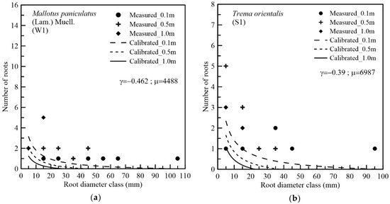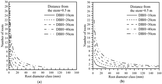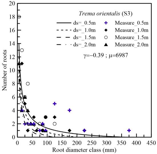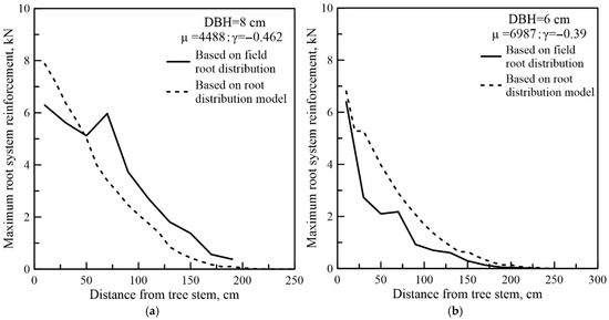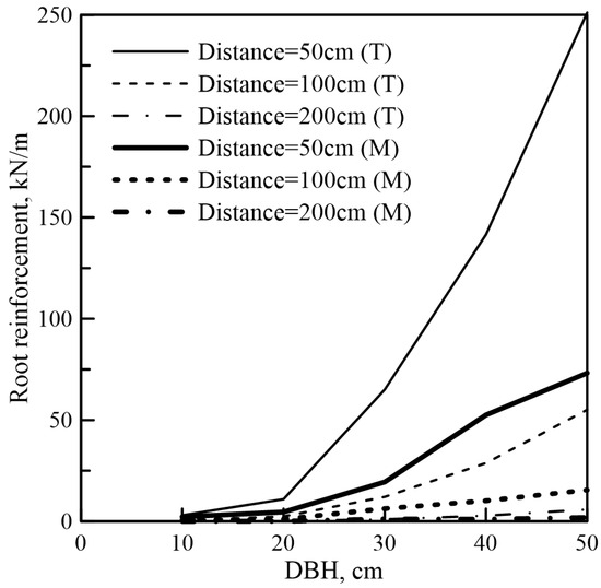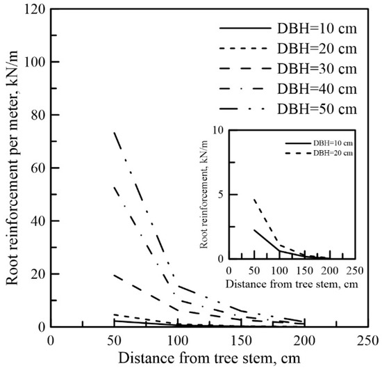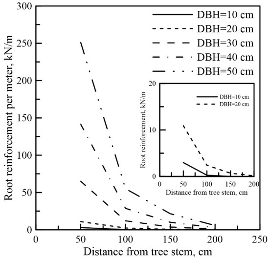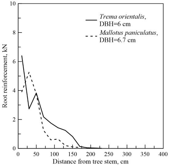 - Tree size significantly influences root reinforcement: Diameter at breast height (DBH) is a critical factor in determining tree root reinforcement. For Trema, root reinforcement values at 100 cm from the stem were 0.3, 2.4, 12.1, 28.7, and 55.1 kN/m for DBHs of 10, 20, 30, 40, and 50 cm, respectively. For Mallotus, the corresponding values were 0.6, 1.1, 6.3, 10.1, and 15.4 kN/m.