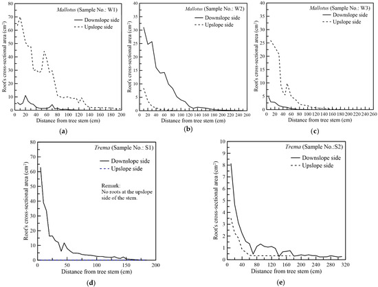 - Large trees provide significantly greater root reinforcement than smaller ones: The root reinforcement of Mallotus with a DBH of 30 cm was 8.8 and 10.3 times greater than that of a tree with a DBH of 10 cm at 50 cm and 100 cm from the stem, respectively. For Trema, these values were even higher—21.7 and 45 times greater—at the same distances.
