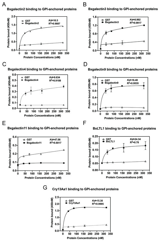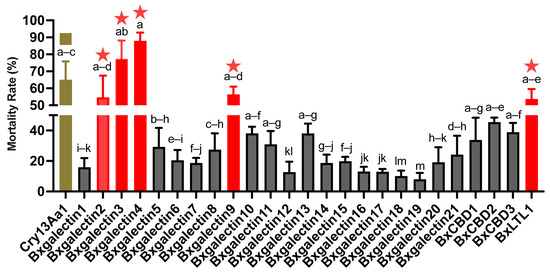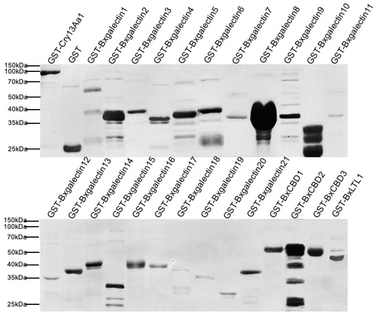 3.3. Expression of Cry13Aa1, GST, and B. xylophilus Lectin Proteins