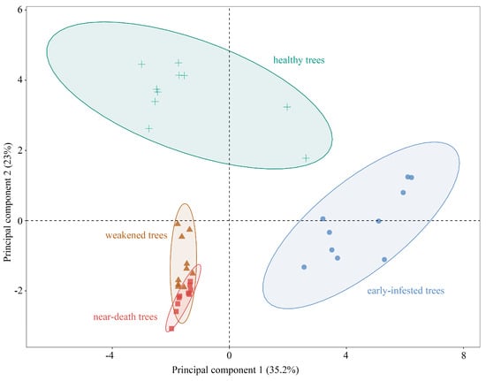 Principal component analysis (PCA) of VOCs emitted by Pinus yunnanensis trunks across infestation stages: healthy, early-infested, weakened, and near-death.