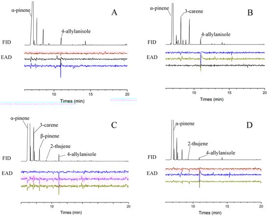 GC-EAD recordings of Tomicus yunnanensis antennal responses to VOCs emitted by Pinus yunnanensis at four infestation stages: healthy (A), early-infested (B), weakened (C), and near-death (D). EAD-active compounds are labeled above corresponding FID peaks. Yellow, purple, and cyan traces represent synchronized EAD responses from three biological replicates.