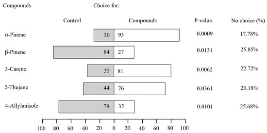 Choice rate (%) of Tomicus yunnanensis when selecting between volatiles from five GC-EAD-active compounds.