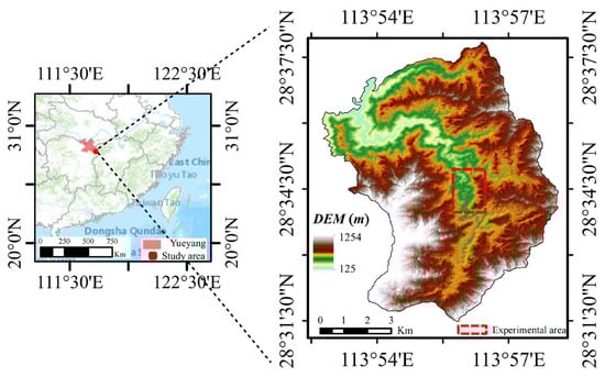 The proposed filtering method was validated on the Lutou experimental forestry farm of Central South University of Forestry & Technology (CSUFT) located in Yueyang City, Hunan Province, as shown in Figure 1, with a total area of 4940 ha and a forest cover of 92%. The landscape is dominated by middle and low mountains, with altitudes ranging from 124 m to 1273 m and slopes of approximately 15°~45°. The site belongs to the humid continental monsoon climate zone, with an average precipitation of 1624.8 mm per year and an average annual temperature of 16.8·°C. The primary tree species include Cyclobalanopsis glauca (Cyclobalanopsis glauca (Thunb.) Oerst.), Castanopsis eyrei (Castanopsis eyrei (Champ.) Tutch.), Chinese fir (Cunninghamia lanceolata), and some species of Camelliaceae and Magnoliaceae.