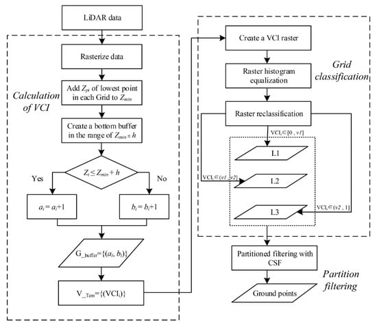 The core idea of the PCSF method is to partition raw point clouds of the forested areas according to the spatial differences in vegetation cover, which are evaluated by the vegetation cover index (VCI), and then perform filtering at the partition level by using CSF with an optimal parameter setting. The method includes three sections: calculation of VCI, grid classification, and partition filtering. The method flow is shown in Figure 2.