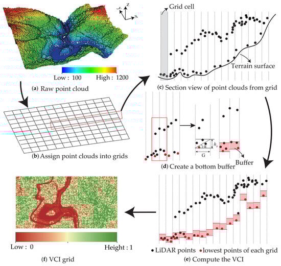 Sketch map of vegetation cover index (VCI) acquisition. (a) Raw point cloud; (b–e) construction and derivation process of the VCI; (f) converted VCI grid data.