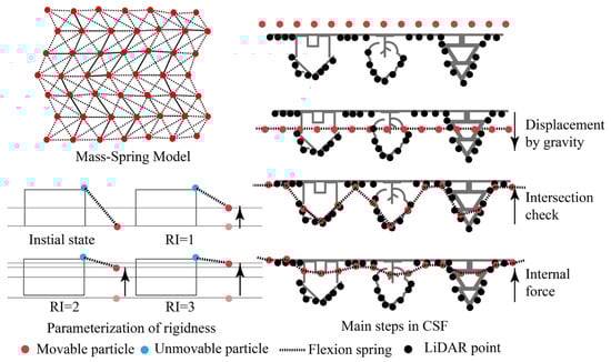 We implement partitioned filtering for each partition. CSF with optimal parameter settings is applied to each partition separately for ground filtering. CSF is a surface-based filtering algorithm that adapts the “cloth simulation” of 3D computer graphics to the filtering process of LiDAR clouds [30]. Construct a mass-spring model to simulate the “cloth” the displacement of masses is controlled by gravity and the internal force of the model, thus changing the shape of the cloth to simulate the terrain. First, the original point cloud is turned upside down, and then the cloth model is assumed to fall from above the inverse point cloud by gravity. The final shape of the cloth is determined by analyzing the interaction between the particles of cloth and the surrounding LiDAR points, as well as between the particles of the cloth. Finally, the point clouds are classified into ground and non-ground points according to the distance between the points and the cloth model (Figure 4).
