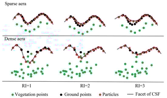 Major parameters of CSF include rigidness (RI), grid resolution (GR), and distance threshold (hcc), where RI is the most critical parameter and determines the magnitude of the internal force of the cloth model. Opting for an appropriate RI for different vegetation cover areas can yield a superior filtering result. For areas with sparse vegetation cover, the sensor of the UAV-LiDAR scanner receives many echoes from the ground. Therefore, the smaller the RI is, the softer the simulation cloth and the finer the depiction of terrain changes. As surface vegetation cover increases, decreasing LiDAR points fall on the ground, with a smaller RI, and it is more likely that vegetation points will be mistaken for ground points (Figure 5). Based on such characteristics, an RI of 1 was set in L1, an RI of 2 was set in L2, an RI of 3 was set in L3, and then ground filtering was executed at the partition level. In addition, a sensitivity analysis of parameters GR and hcc was carried out in the discussion (Section 4) considering their effects on the filtering results of different partitions.