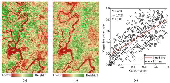 Figure 6 shows the reliability evaluation results of the VCI. The CC generated from LiDAR data and VCI were generally consistent (Figure 6a,b). The Pearson correlation analysis between VCI and CC illustrated that VCI has a significant positive correlation with CC, with a correlation coefficient of r = 0.708 (p < 0.05) (Figure 6c).