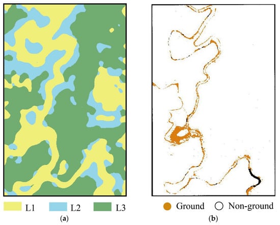 The partitioning and filtering results of the experimental area are presented in Figure 7. The distribution of L1, L2, and L3 was interspaced (Figure 7a). L1 was distributed in a linear pattern, and the feature types in the area were dominated by forested roads and buildings. The L2 and L3 areas were dominated by vegetation and were distributed in patches and blocks, with L2 having a smaller area, mainly around L1, and the largest percentage of the area was occupied by L3. The filtering results indicated that PCSF could filter a large forested area (Figure 7b).