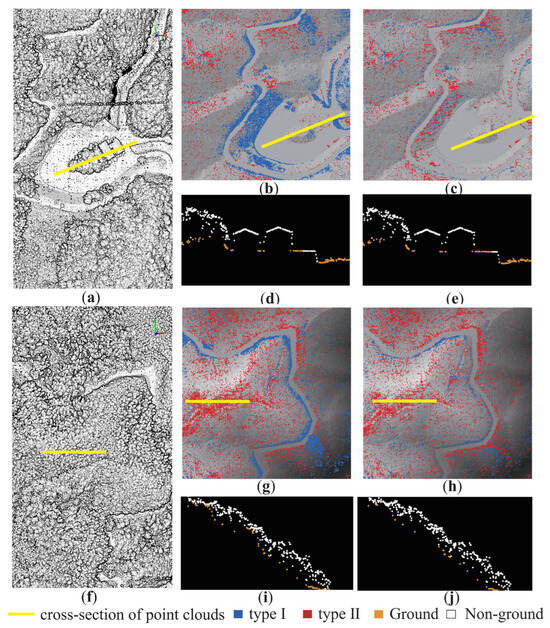 The spatial distribution of type I and type II errors and the point cloud cross-sections of CSF and PCSF are shown in Figure 8. The results demonstrated that type I error points were more likely to occur in areas with sparse vegetation cover, and type II errors mainly existed in areas with dense vegetation cover. Compared with CSF, PCSF significantly reduced type I errors (Figure 8b,c) and slightly decreased type II errors (Figure 8i,j). As shown by the point cloud cross-section details, PCSF could distinguish ground and non-ground points effectively (Figure 8d,e,i,j)