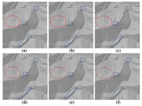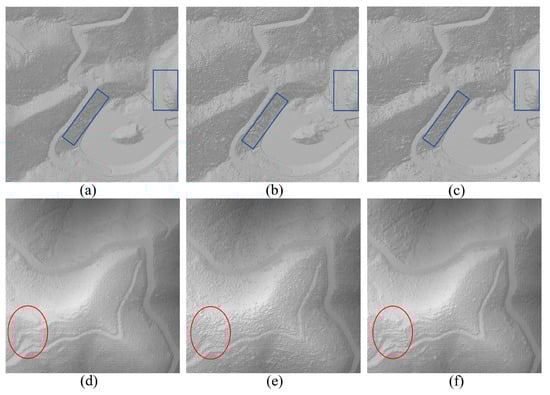 Comparison of the DEM details. (a–c) represent the DEMs of the reference data, CSF, and PCSF in the sparse vegetation cover area, respectively; (d–f) represent the DEMs of the reference data, CSF, and PCSF in the dense vegetation cover area, respectively. The red circle indicates the “convex hull” in the DEM, and the blue box indicates the lack of terrain details.