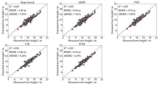 In this study, a total of 131 individual trees could be correctly segmented from the CHM obtained after processing by all five filtering methods. To analyze the effect of filtering on tree height estimation by LiDAR data, we compared their extraction accuracy (Figure 10). The extracted tree height of slope-based filtering was determined to be the worst, with an R2 of 0.84 and the highest RMSE of 1.00 m. PCSF achieved the best fitting effect (R2 = 0.93) and the lowest RMSE of 0.53 m. The rRMSE of PCSF was reduced by 1.24%–3.84% compared with other methods. A significance test of the absolute values of tree height residuals showed that PCSF significantly differed from other methods (p < 0.05), which indicated that filtering with PCSF can significantly improve the extraction accuracy of tree heights.