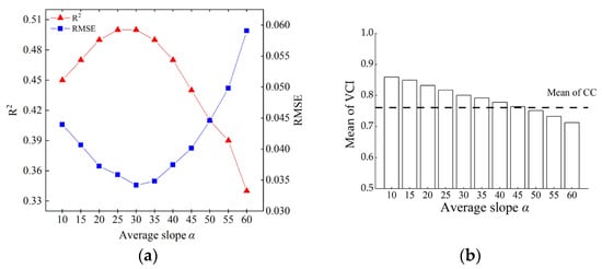 VCI estimation results for different average slopes α. (a) Accuracy of VCI with different α; (b) mean of VCI with different α.