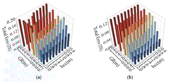 RI, GR, and hcc are key parameters of CSF. RI was set based on the partitioning results (Section 3). GR affects the filtering fineness and working time, and hcc determines the classification of raw points as ground points and non-ground points. To quantify their effects on the filtering results, we performed a sensitivity analysis of GR (from 0.3–2 m) and hcc (from 0.2–2 m with steps of 0.2 m). As shown in Figure 12, the total error (TE) of the three partitions continues to increase with increasing GR (Figure 12a–c). The size of GR determines the number of cloth particles and is closely related to the fineness of the cloth model [30]. The number of particles increases with a smaller GR, and the cloth model becomes finer, decreasing the filtering error.