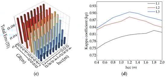 With the increase in hcc, the trend of changes in filtering accuracy TE values in the three partitions is similar. Additionally, we found that limiting values exist for hcc, which differ in diverse vegetation cover areas. When hcc is lower than the limiting value, TE decreases with increasing hcc; when hcc is higher than that, TE increases with increasing hcc (Figure 12a–c). To explore partition-specific hcc thresholds, GR was set as 0.3 m, and the correlation of filtering accuracy (kappa) and hcc of the three partitions is illustrated in Figure 12d. L2 and L3 yielded the highest filtering accuracy at an hcc of 1.2 m, and L1 achieved the highest filtering accuracy at an hcc of 1.8 m. This occurs because the vegetation in L1 is sparse, and thus, the collected points are dominated by ground points. Setting a higher hcc can reduce the misclassification of ground points. Both L2 and L3 contain a great number of vegetation points and have similar feature characteristics, so the sensitivity analysis results of hcc in L2 and L3 are consistent. The large density of point clouds, where ground points that have not been correctly classified still persist in L1 and cause a high type I error, may be the reason why the filtering accuracy of L3 is higher than that of L1. A similar result was obtained by Cai et al. [53] when using a high density of point clouds for ground filtering. In addition, the surface in L3 is covered by only uniformly distributed vegetation. In contrast, the surface cover in L1 is more complex (including sparse low vegetation, bridges, roads, and buildings), increasing the difficulty of filtering and leading to low accuracy. The results of Chen et al. [54] and Moudry et al. [28] also illustrate that the simpler the ground cover is, the better the filtering results in the region.