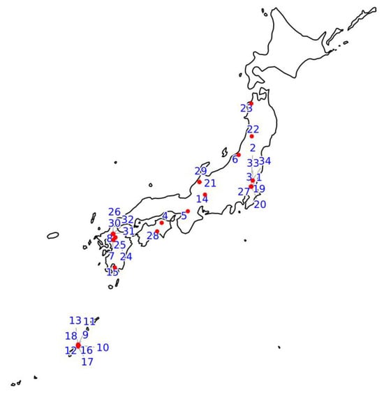Figure 1 shows the location of soil sampling sites. Japan is one of the most volcanically active countries in the world. While the geological basement consists mainly of tuff and sedimentary rocks, the surface soils are widely influenced by the addition and deposition of volcanic ash. According to the Fundamental Soil Classification Chart of Japan (Japanese Society of Pedology [26]), Brown Forest Soils (Cambisols in World Reference Base for Soil Resources (WRB) (IUSS Working Group WRB [27]) account for 33.2% of the land area, followed by Andosols (Andosols in WRB [27]) (30.3%), Fluvic Soils (Fluvisols in WRB [27]) (13.7%), Red-Yellow Soils (Acrisols, Lixisols, Alisols, or Luvisols in WRB [27]) (7.6%), and Regosols (Regosols and Lithosols in WRB [27]) (6.9%). The 34 sampling sites used in this study are distributed across the Japanese archipelago, covering a wide range of climatic and geological conditions. In central Japan (e.g., sites 1–5, 14, 19–21, 33, 34), volcanic ash–derived Andosols (Andosols in WRB [27]) are dominant [28], while western Japan (sites 7, 24–32) features forest soils developed from a variety of parent materials [28]. Sites in southern Kyushu (sites 8, 15) are strongly affected by volcanic activity [28], and the subtropical Ryukyu Islands (sites 9–13, 16–18) are characterized by highly weathered Red-Yellow Soils (Acrisols, Lixisols, Alisols, or Luvisols in WRB [27]) [28].