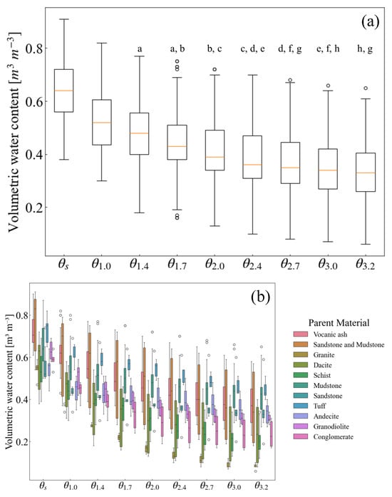 Boxplots of the volumetric water content: (a) volumetric water content at a given matric suction (n = 151), and (b) volumetric water content by parent material at a given matric suction (n = 151). In (a), the orange lines and white circles corresponded to the mean volumetric water content at a given matric suction and outliers, respectively. Significant differences (p < 0.05) weren’t observed between box plots with the same letters.