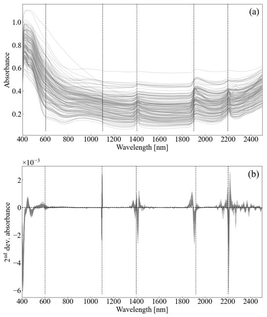 Figure 3 shows the absorbance spectra of the soil samples and their second derivative. As the soil moisture content increased, the peak positions remained constant, although the reflectance decreased [35]. The absorbance spectra (Figure 3a) had several characteristic shoulders and peaks. The shoulder near 1100 nm is commonly associated with the first and second overtones of O–H stretching and water vapor absorption [36]. Strong absorption peaks below 600 nm may be attributable to organic matter, as the absorbance near 570–700 nm has previously been linked to chromophoric organic compounds [37]. Broad and overlapping peaks at 600–750 nm suggest potential contributions from both organic matter and other chromophores. This feature is more clearly observed in the second derivative (Figure 3b), where small but consistent variations suggest superimposed peaks in this range. This interpretation aligns with previous studies reporting that multiple weak absorbance features related to organic components and iron oxides can overlap in this spectral window. In addition, relatively strong peaks were observed near 1900 nm, and weak peaks were observed around 1400 and 2200 nm. The increase in absorption at 2250–2500 nm suggests contributions from various clay minerals, particularly those associated with O–H and H2O overtones [3]. Specifically, the peaks near 1400 and 1900 nm are typically related to bound water vibrations, while those near 2200–2500 nm correspond to metal–OH bonds involving elements such as Al, Fe, and Mg [3].